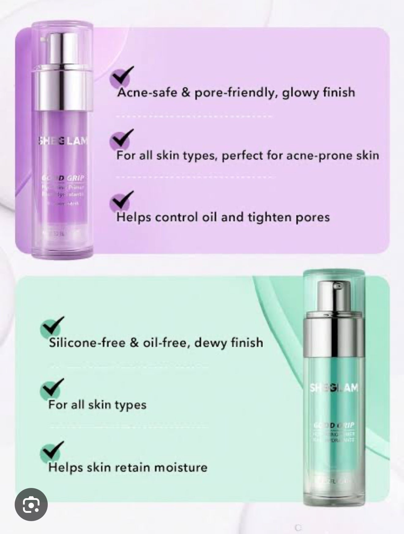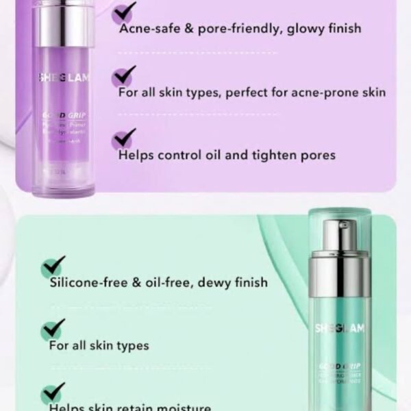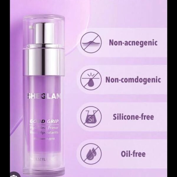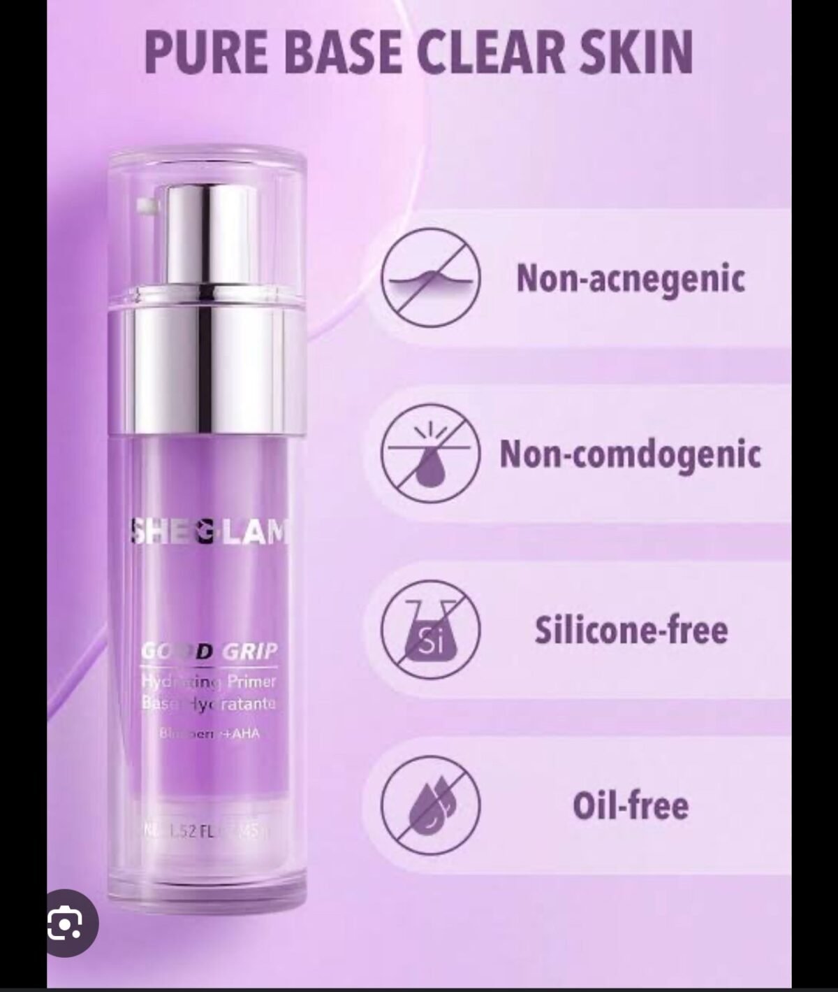 Achieve a flawless base with SHEGLAM Good Grip Hydrating Primer. This oil and silicone-free formula delivers all-day hydration while controlling excess shine. Infused with Blueberry extract and AHA (Alpha Hydroxy Acid), this lightweight gel primer smooths fine lines, refines texture, and preps your skin for long-lasting makeup wear. Perfect for oily and combination skin types, the purple-toned formula visibly brightens and balances skin tone. Use daily for a refreshed, shine-free glow.